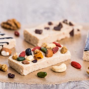 - Cut into bars with a large knife and decorate as desired with some high-quality dark chocolate, dried fruit, nuts or similar. Store in the refrigerator.