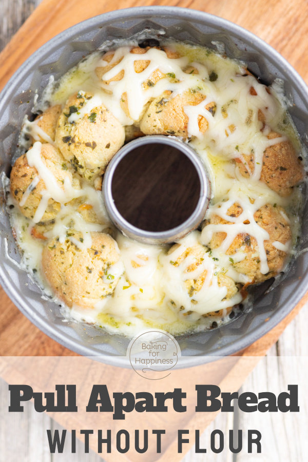 To form the rather sticky dough, it is recommended to sprinkle the work surface with ground almonds or (ingenious!!!) Parmesan. The low carb party bread without flour rises a little less but is much moister and for a longer time fresh than the normal. For extra pizzazz, add some herb butter as well as grated cheese. We also like to snack on my hearty glutenfree plucked bread with a dip or salad.